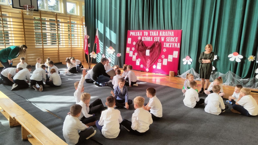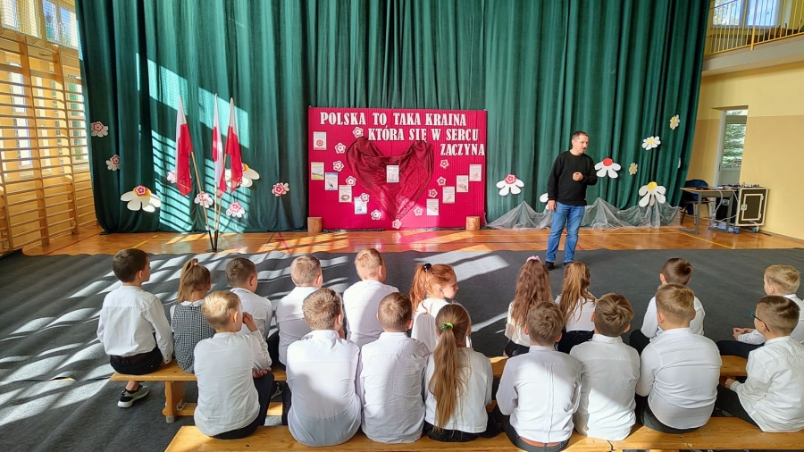 Na sali gimnastycznej, udekorowanej w biało czerwone barwy, przedszkolaki wraz z uczniami klas I – VIII przedstawili program artystyczny nawiązujący do burzliwych i często dramatycznych losów naszej Ojczyzny. Wierszem, tańcem, pieśnią opowiadali o zwycięstwach i klęskach jakich doznawał nasz Naród na przestrzeni wieków. Program został przygotowany pod kierunkiem nauczycielek: Emilii Ceklarz, Anny Kozy oraz Bernadety Kaletki.