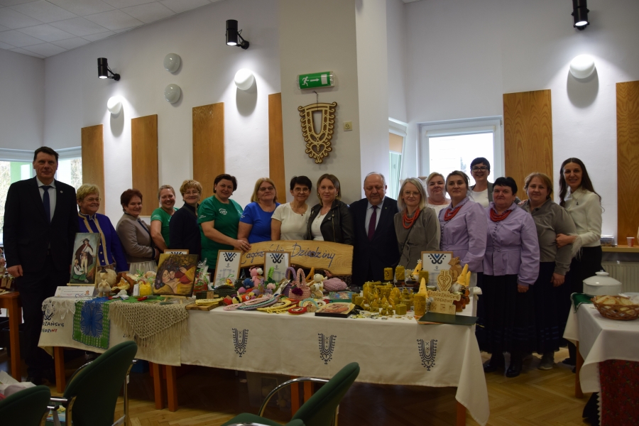 Na tak ważnym i licznym! wydarzeniu nie mogło zabraknąć Zagórzańskich Dziedzin, które są żywym dowodem na to jak oba zagadnienia razem połączyć z korzyścią zarówno dla samych kobiet, jak i całej społeczności, nie wspominając o promocji pięknego, zagórzańskiego regionu. W Karniowicach zawsze pokazujemy się z najlepszej strony, więc i tym razem było dobre jedzenie i bogato przygotowane stoisko z produktami lokalnymi i rękodziełem. Tylko powitania ze znajomymi uzmysłowiły nam, że przecież „tak niedawno” widzieliśmy się tutaj w okolicach Świąt Bożego Narodzenia, a teraz to już czas między Dniem Kobiet a Wielkanocą… Stąd też zazieleniło nam się na stołach; pojawiły się tam kurki, koguciki, serwetki na koszyczki (Zosia Piętoń), sznurkowe koszyczki i wiosenne, wyplatane cuda (Sznurkowe Perełki), wielkanocne baranki i pisanki jako woskowe świeczki, a na przekąskę miód, na osłodę (Pasieka u Piotra Woźniaka z Koniny) i pyszne serki gorczańskie (Monika Kubik). Tak prezentował się nasz stoiskowy team, który zmieścił jeszcze foldery i ulotki z Bazy Szkoleniowo-Wypoczynkowej „Lubogoszcz”, Drzewniane łobrozki Józi Potaczek, Drewniane cuda z Kasinki oraz koronki Krysi Kaczmarczyk z Olszówki.