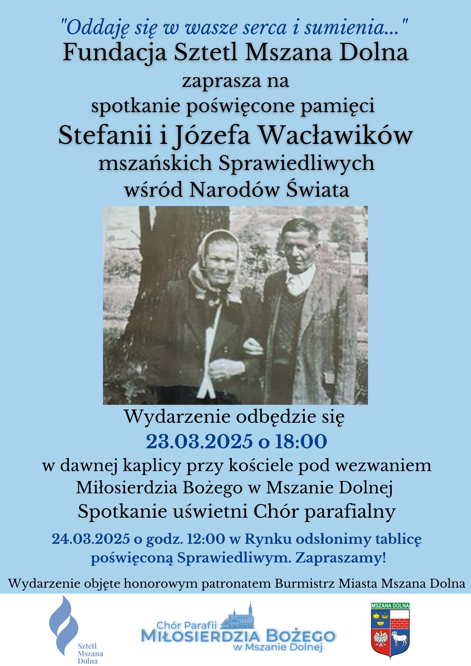 W przeddzień tego dnia, 23.03.2025 Fundacja Sztetl Mszana Dolna zaprasza na spotkanie, podczas którego przybliży sylwetki mszańskich Sprawiedliwych wśród Narodów Świata, Stefanii i Józefa Wacławików. Ci ubodzy, skromni rolnicy, z Mszany Dolnej, uratowali z Zagłady Moszego Maurycego Jereda, przyjmując go do swojego domu i ukrywając od listopada 1942 r. do stycznia 1945 r. Narażali życie własne i gromadki swoich dzieci, by ocalić nieznanego sobie wcześniej Żyda, który w masowej egzekucji na Pańskim, 19.08.1942 r. stracił żonę i małą córeczkę, a sam, z grupą młodych mężczyzn, został zostawiony do pracy w pobliskim kamieniołomie. Po ucieczce stamtąd, trafił do domu Państwa Wacławików pod Małą Górą.