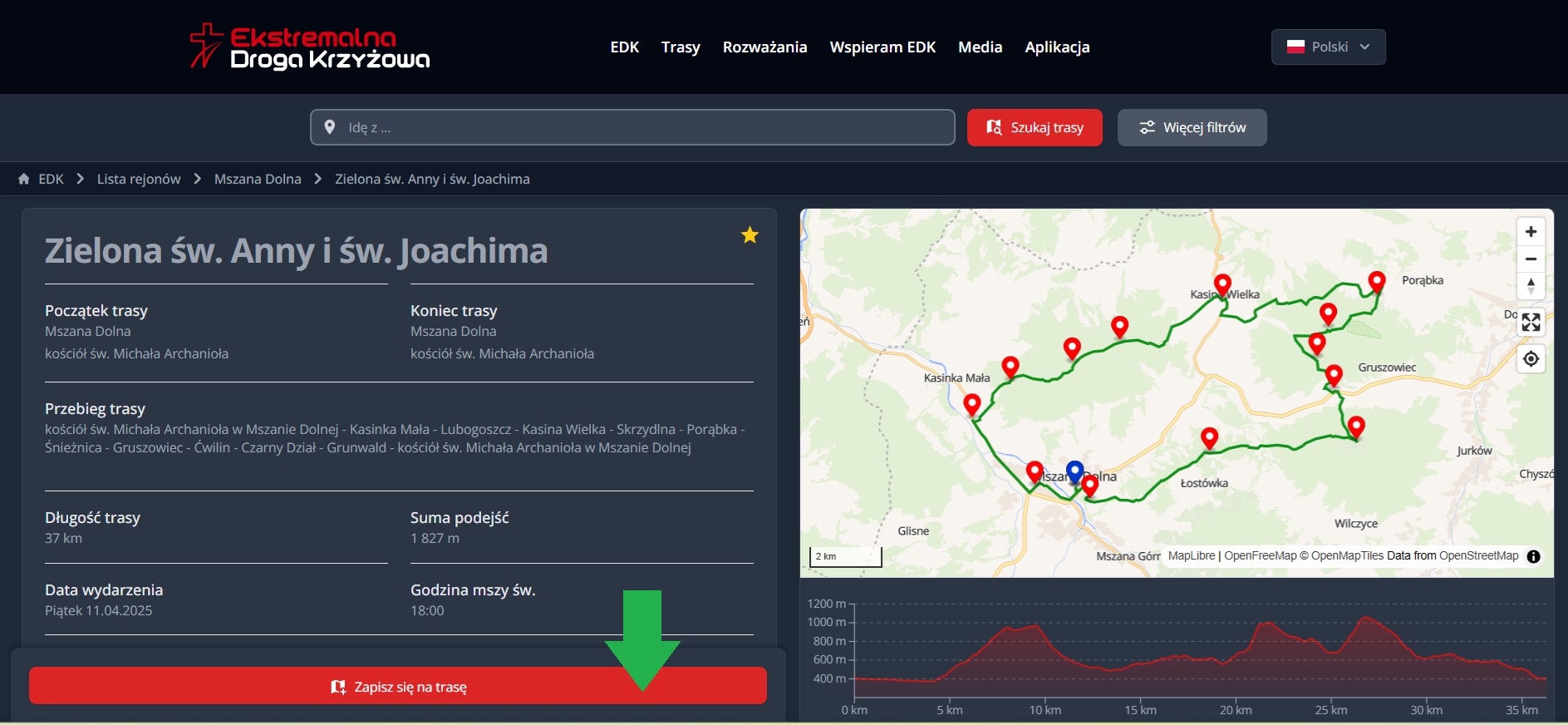 Trasa zielona im. św. Anny i św. Joachima rozpoczyna się i kończy w kościele św. Michała Archanioła. Przebiega górami Bieskidu Wyspowego przez: Lubogoszcz, Śnieżnicę, Ćwilin, Czarny Dział i Grunwald. Prowadzi w większości pieszymi szlakami turystycznymi, a także lokalnymi drogami asfaltowymi, utwardzanymi lub polnymi. Długość trasy wynosi ok. 37 km, suma podejść – ok. 1800 m. Trasa pokonywana jest w nocy. Podczas drogi obowiązuje zasada milczenia.
