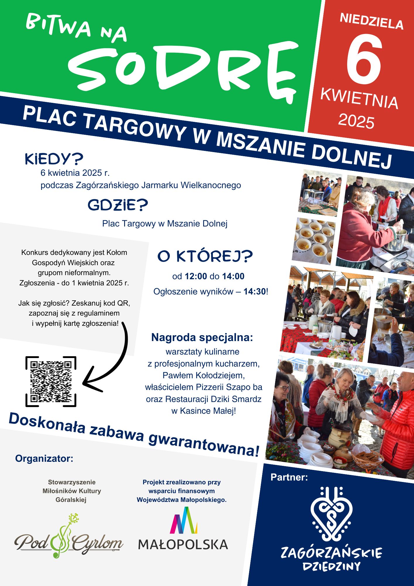 Zgłoście się koniecznie do „Bitwy na sodrę”, którą zaplanowano na 6 kwietnia 2025 r., podczas Zagórzańskiego Jarmarku Wielkanocnego, na Placu targowym w Mszanie Dolnej. Degustacja sodry potrwa od 12:00 do 14:00; ogłoszenie wyników głosowania publiczności przewidziano na 14:30.