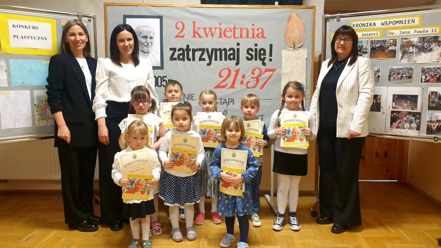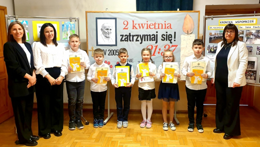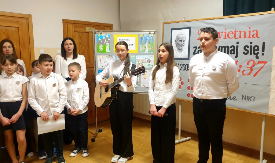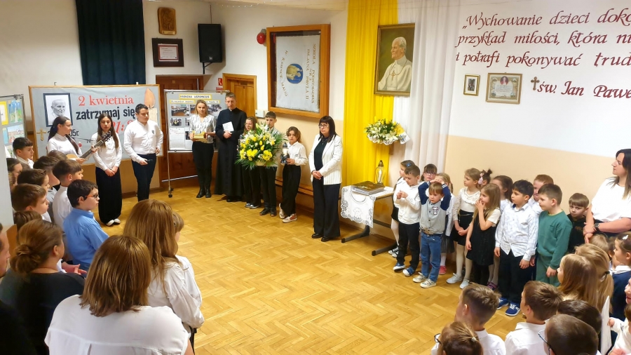 Pierwszym z nich był apel, wspólna modlitwa, złożenie kwiatów i zapalenie zniczy przy szkolnym pomniku oraz śpiew jego ulubionej pieśni pt.”Barka”. Wszystko to miało miejsce w dzień rocznicy śmierci, czyli 2 kwietnia 2025 r. Podczas tych uroczystości Pani Dyrektor Barbara Tokarz wręczyła również nagrody wszystkim uczniom, którzy czynnie włączyli się w obchody święta i napisali do Papieża modlitwę, list lub narysowali dla niego obrazek. Kolejny etap to wyjazd uczniów klas III-VIII wraz z wychowawcami na film pt. „21:37” upamiętniający postać Wielkiego Polaka. Wszystko zakończyła Droga Krzyżowa, w której wzięli udział: Proboszcz Parafii Kasinka Mała Ks. Paweł Rybski R.M., wikariusz Ks. Mateusz Bochenek, orkiestra Sami Swoi, Schola Jedność oraz Rodziny uczniów i mieszkańcy Kasinki Małej.