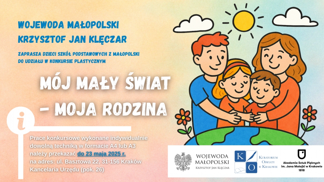 Prace konkursowe należy dostarczyć w terminie do 23 maja 2025 r. do Małopolskiego Urzędu Wojewódzkiego w Krakowie na adres: ul. Basztowa 22, 31-156 Kraków, Kancelaria Urzędu - pok. 26 z dopiskiem Udział w Konkursie „Mój mały świat – moja rodzina.”