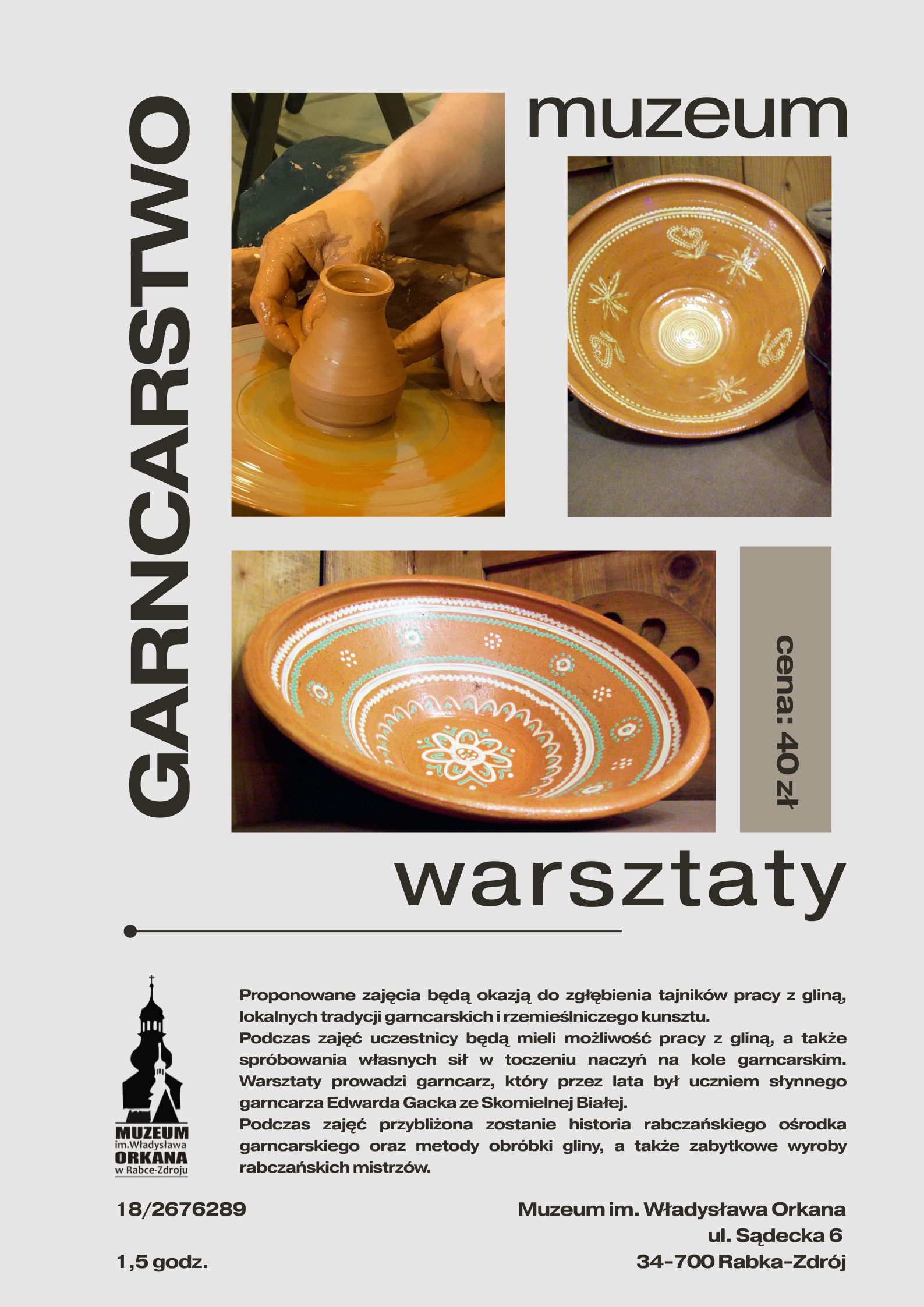 Proponowane zajęcia będą okazją do zgłębienia tajników pracy z gliną, lokalnych tradycji garncarskich i rzemieślniczego kunsztu. Podczas zajęć uczestnicy będą mieli możliwość pracy z gliną, a także spróbowania własnych sił w toczeniu naczyń na kole garncarskim. Warsztaty prowadzi garncarz, który przez lata był uczniem słynnego garncarza Edwarda Gacka ze Skomielnej Białej. Podczas zajęć przybliżona zostanie historia rabczańskiego ośrodka garncarskiego oraz metody obróbki gliny, a także zabytkowe wyroby rabczańskich mistrzów. Zajęcia odbywają się w przestronnej sali Akademii Malarstwa na Szkle znajdującej się w budynku biurowym Muzeum przy ul. Sądeckiej 6. Czas trwania zajęć ok. 1-1,5 godz.