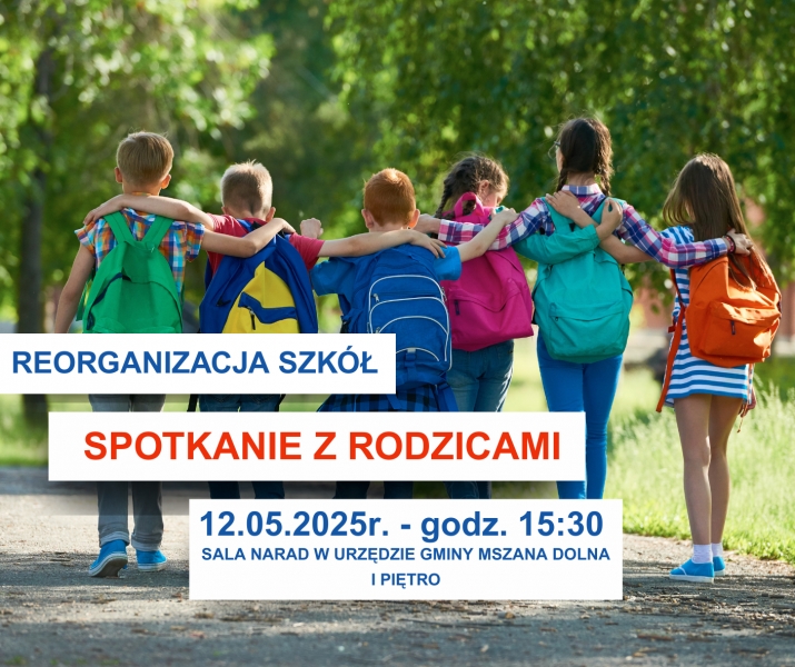 Wójt Gminy Mirosław Cichorz zaprasza Mieszkańców na spotkanie dotyczące reorganizacji szkół na terenie Gminy Mszana Dolna! Spotkanie odbędzie się w poniedziałek, 12 maja 2025 r., o godzinie 15:30 w sali narad (I piętro) budynku Urzędu Gminy Mszana Dolna.