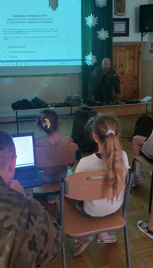 Szkoła gościła dwóch żołnierzy 114. Batalionu Lekkiej Piechoty w Limanowej, którzy przeprowadzili zajęcia edukacyjne oraz zaprezentowali sprzęt, którym na co dzień się posługują. Głównymi tematami były: bezpieczeństwo, zagrożenia: cyfrowe, w szkole, poza szkołą, alarmowanie, ewakuacja, ratownictwo medyczne: RKO, numery alarmowe, ochrona, schronienia. Uczniowie brali czynny udział w lekcji, dopytywali o interesujące ich zagadnienia. Poznali wyposażenie i części umundurowania każdego żołnierza. Na koniec sami mogli wypróbować sprzęt, który przywieźli ze sobą żołnierze.