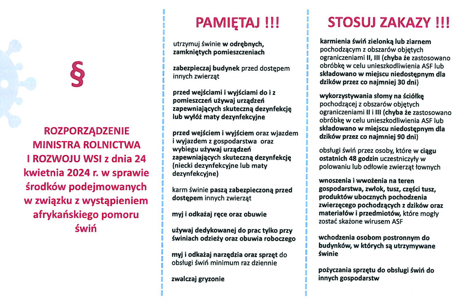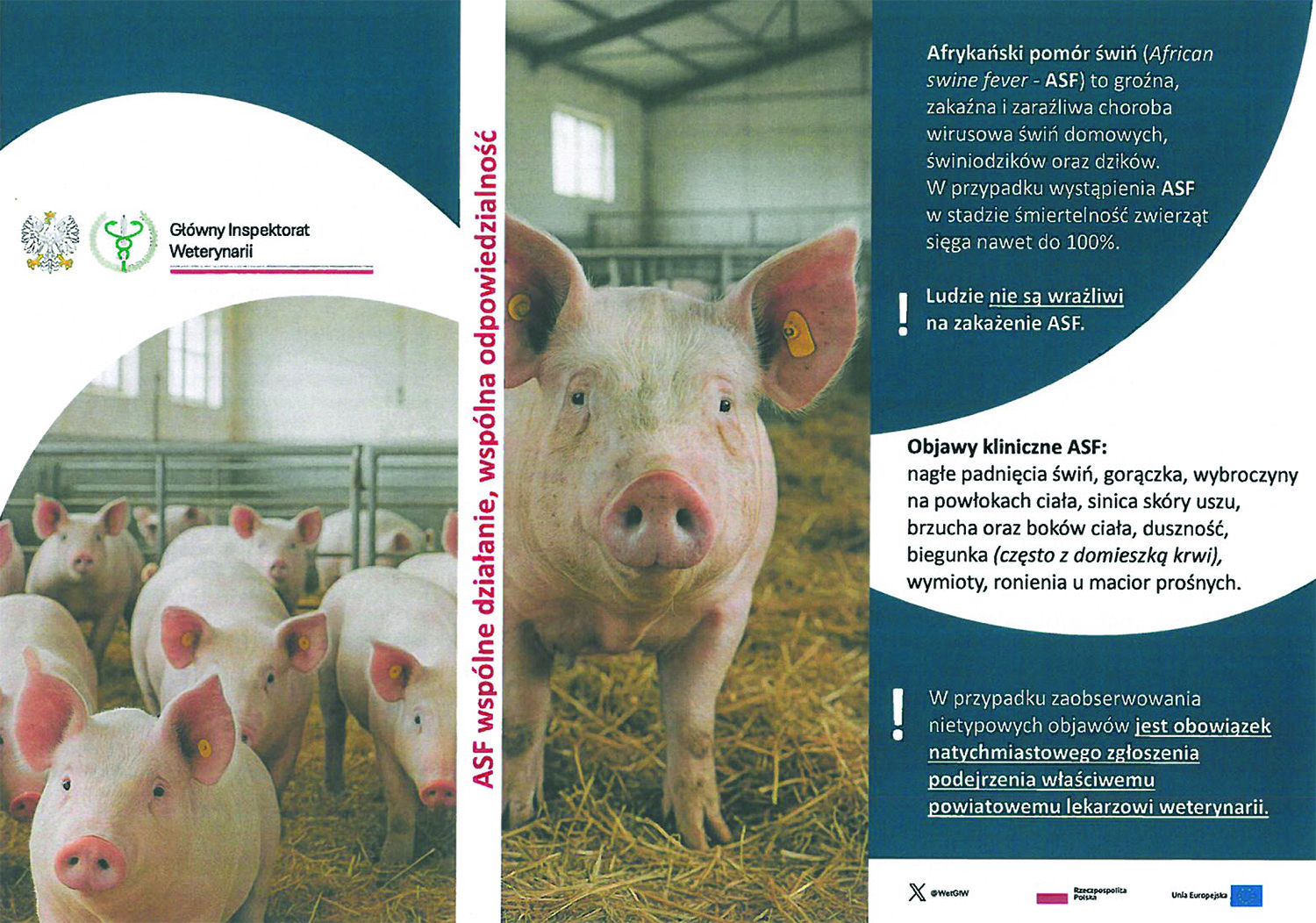 Zachęcamy do zapoznania się z ulotką znajdującą się poniżej, w której znajdują się informacje dla gospodarstw oraz obowiązki hodowców w zakresie dezynfekcji, ochrony paszy i kontrolowania kontaktu zwierząt z dzikami. Udostępniona została również aktualna mapa występowania ASF w Polsce, dostępna pod adresem:https://bip.wetgiw.gov.pl/asf/mapa/.