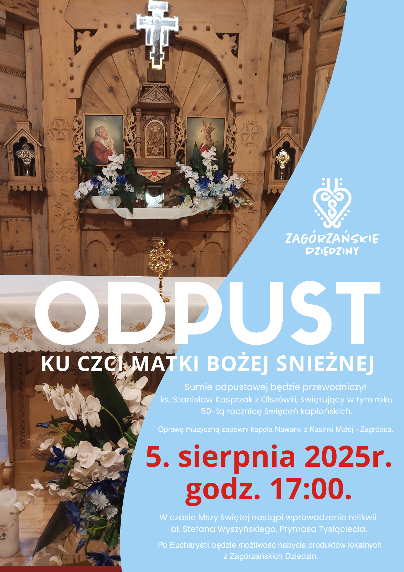 We wtorek, 5 sierpnia b.r., o godz. 17:00, Mszę św. odprawi ks. Stanisław Kasprzak, wieloletni proboszcz z Olszówki, który w tym roku świętuje piękny jubileusz, 50 lecia święceń kapłańskich. Oprawę muzyczną wydarzenia zapewni kapela rodzinna Nawarki z Kasinki Małej – Zagródca, będą też Zagórzanie w swoich strojach regionalnych.