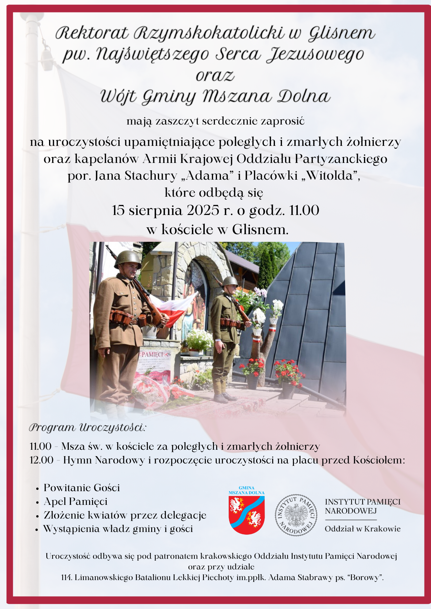 Uroczystość odbędzie się pod patronatem krakowskiego Oddziału Instytutu Pamięci Narodowej oraz z udziałem 114. Limanowskiego Batalionu Lekkiej Piechoty im. ppłk. Adama Stabrawy ps. „Borowy”.