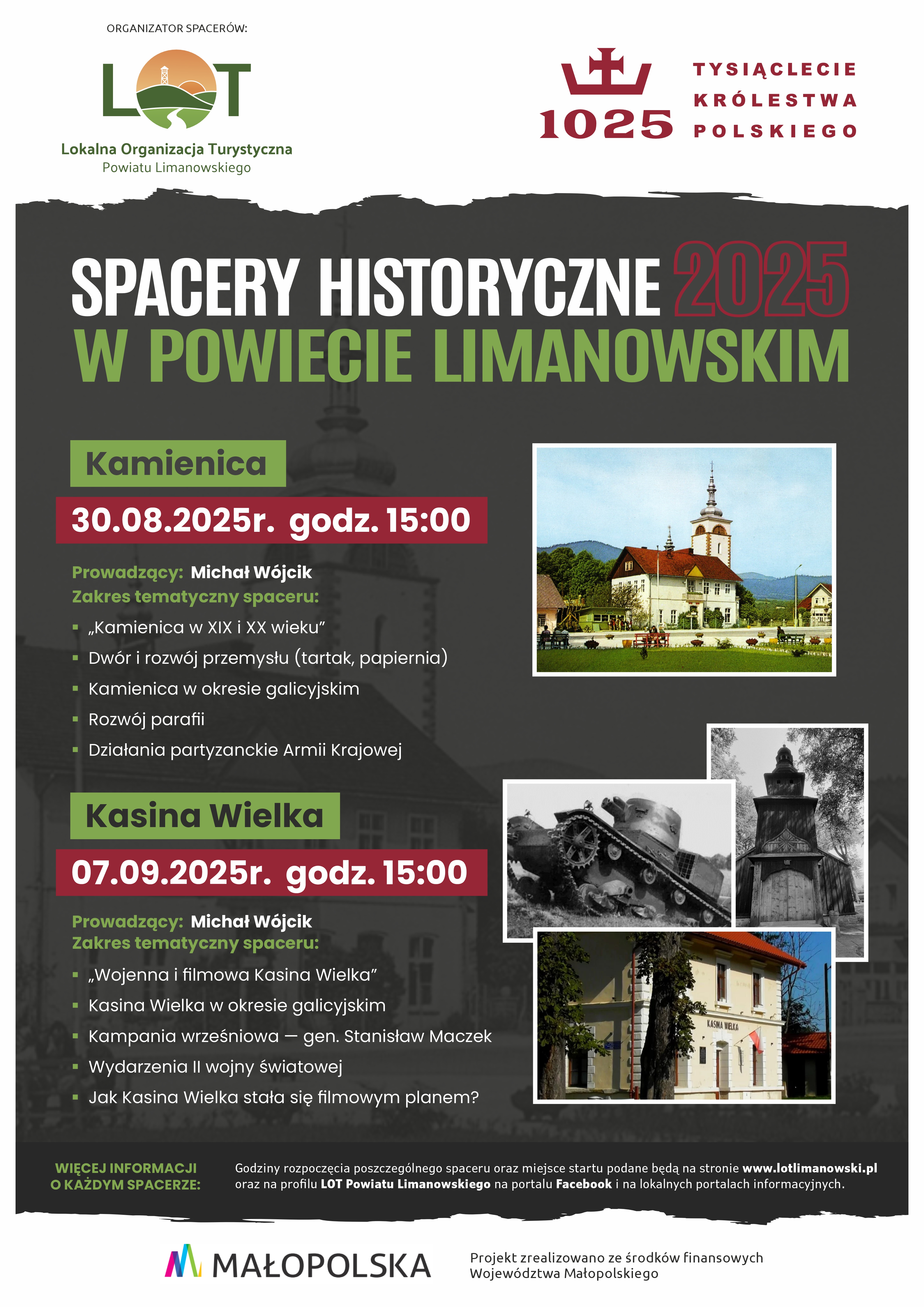 Drugi spacer historyczny pod hasłem: „Wojenna i filmowa Kasina Wielka” rozpocznie się w dniu 7 września 2025r. o godzinie 15:00 przy Pomniku Pamięci Żołnierzy 24 Pułku Ułanów w Kasinie Wielkiej. Tematem drugiego spaceru będzie: