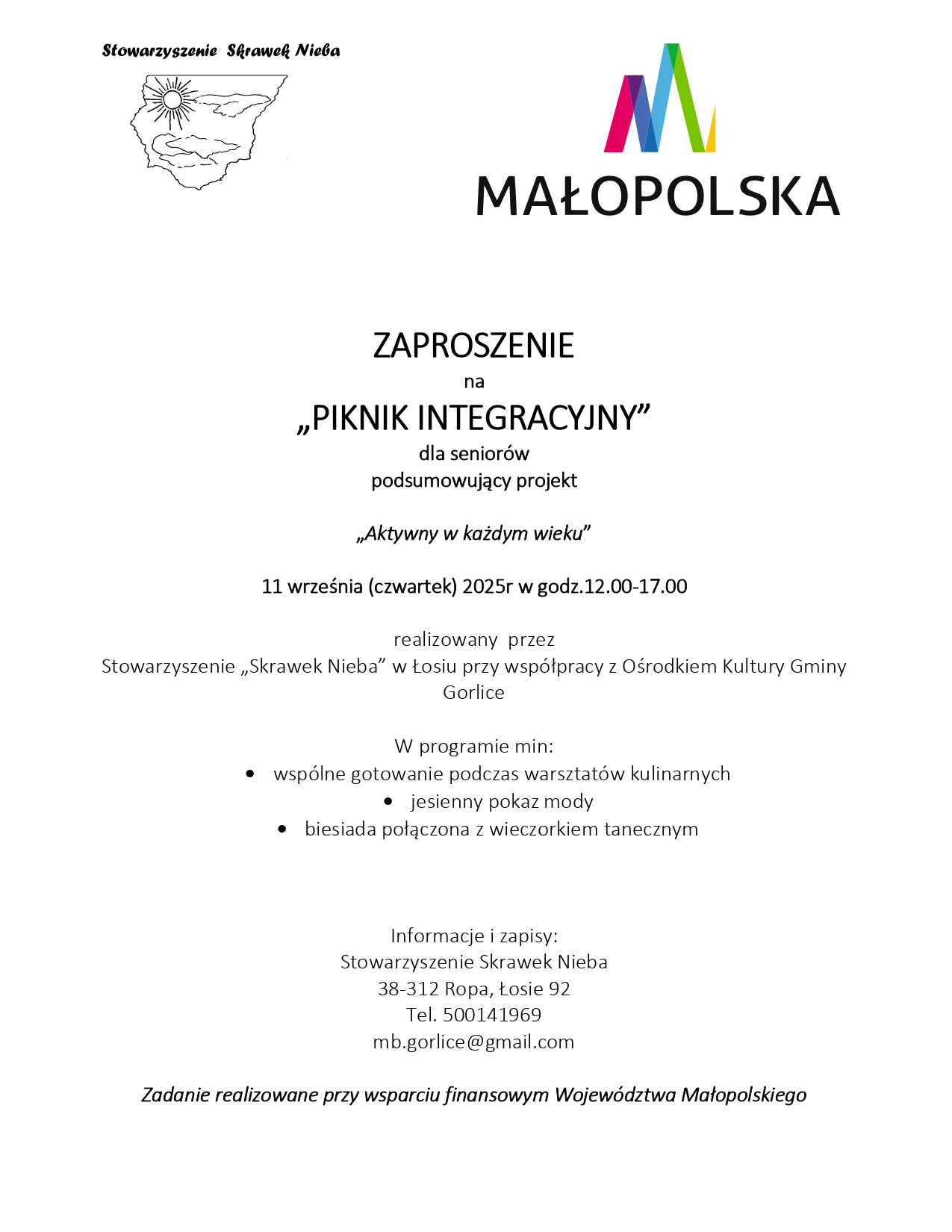 W ramach współpracy Zagórzańskich Dziedzin ze Stowarzyszeniem Skrawek Nieba zagórzańscy seniorzy wezmą udział w "Pikniku integracyjnym" realizowanym w ramach projektu "Aktywny w każdym wieku".
