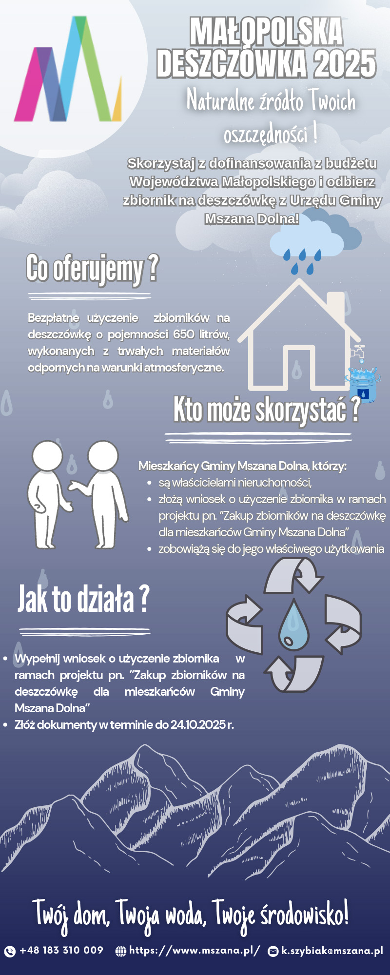 - Regulamin określający formę i zasady przekazywania zbiorników na deszczówkę w ramach projektu współfinansowanego ze środków Województwa Małopolskiego pn. „Zakup zbiorników na deszczówkę dla mieszkańców Gminy Mszana Dolna”