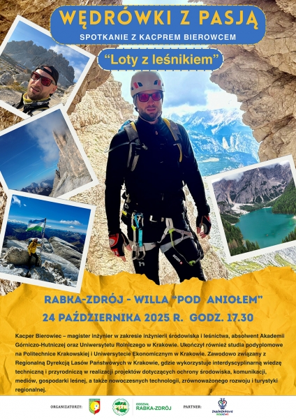 Spotkanie odbędzie się w piątek, 24 października 2025 roku, o godz. 17.30 w willi „Pod Aniołem” przy ul. Parkowej 5 w Rabce-Zdroju. Uczestnicy będą mieli okazję odbyć niezwykłą podróż po górskich szlakach – zarówno z perspektywy wędrowca, jak i... z lotu ptaka. Kacper Bierowiec zaprezentuje bogaty materiał filmowy i fotograficzny, opowie o swoich ostatnich wyprawach, m.in. w Dolomity, a także o pracy leśnika, która łączy nowoczesne technologie z miłością do natury.