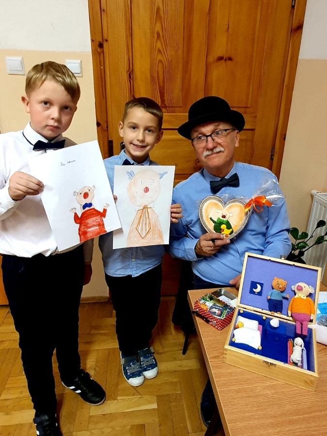 Z uwagi na to, że znany autor przyjechał do nas z samej stolicy, Pani Dyrektor Barbara Tokarz na powitanie ofiarowała mu „regionalny kuferek”, by mógł dowiedzieć się więcej na temat zagórzańskiego regionu i mile wspominać wizytę. Uczniowie zaś przywitali go ułożonym specjalnie na tę okazję wierszykiem i wręczyli mu serce z piernika z wizerunkiem Pana Kuleczki – bohatera jego pierwszej książki. Gość swoją życzliwością, prostotą i ciepłem zauroczył wszystkich już od samego początku, spotkanie zaś potwierdziło, że to człowiek wielkiego serca.