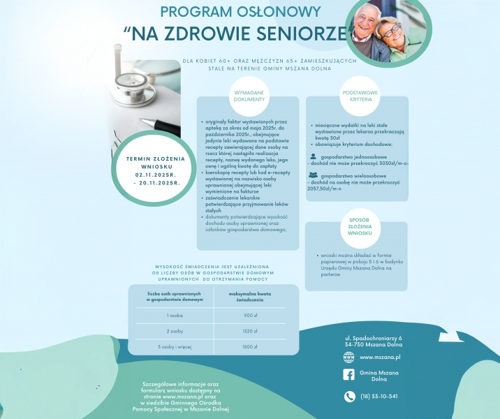 Gminny Ośrodek Pomocy Społecznej w Mszanie Dolnej przypomina o możliwości składania wniosków w ramach programu osłonowego „Na zdrowie seniorze" do dnia 20.11.2025r.