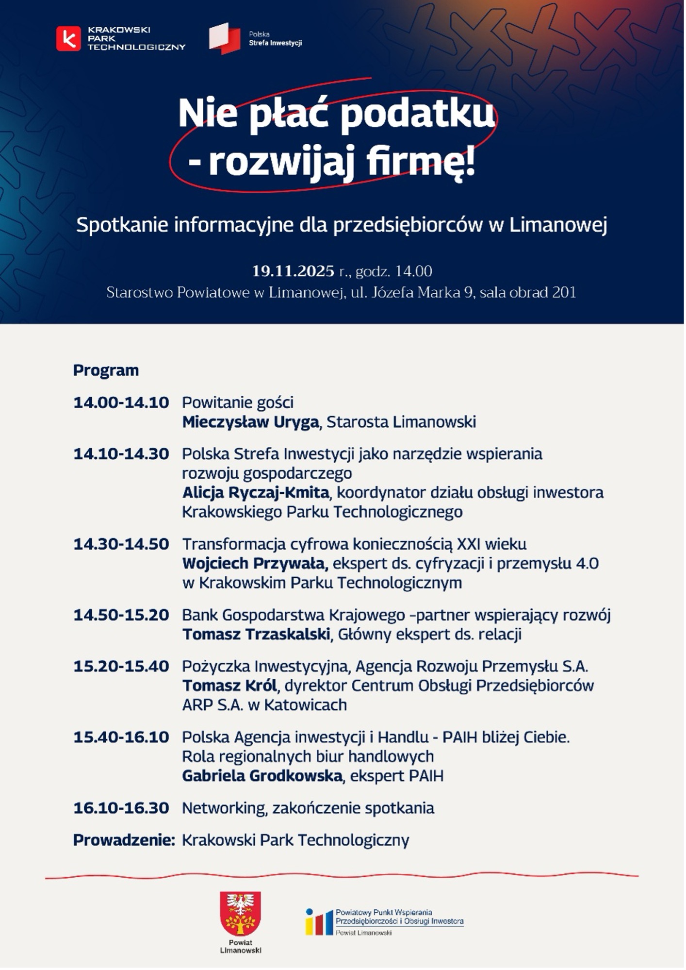 Krakowski Park Technologiczny oraz Powiatowy Punkt Wspierania Przedsiębiorczości i Obsługi Inwestora w Starostwie Powiatowym w Limanowej organizują spotkanie
