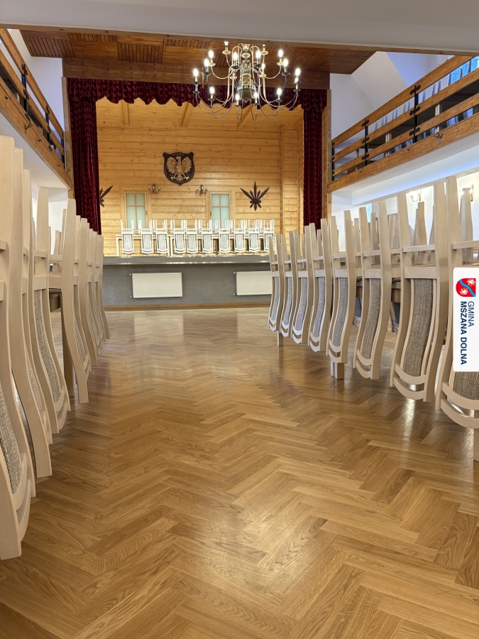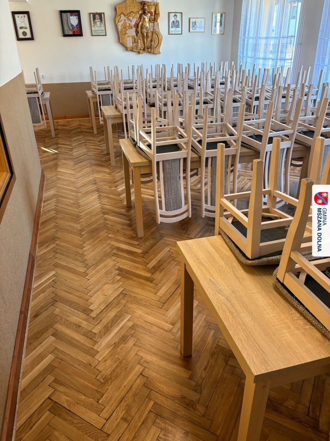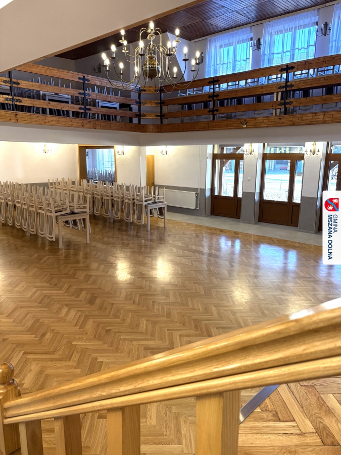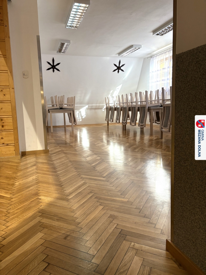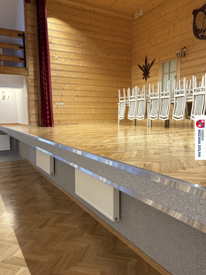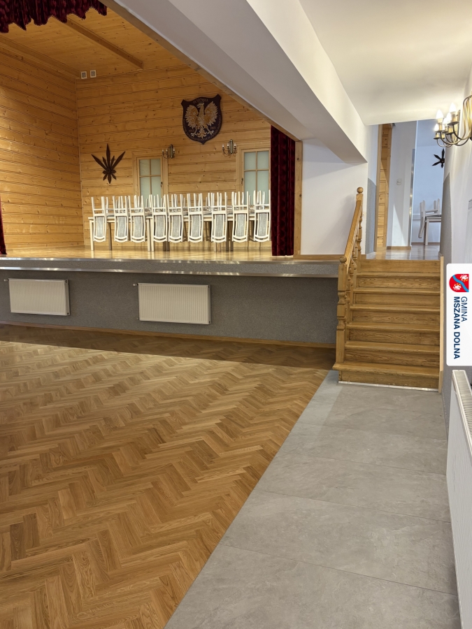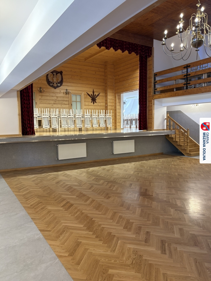 Gmina Mszana Dolna przy wsparciu finansowym pozyskanym z budżetu Województwa Małopolskiego w ramach zadania „Małopolskie świetlice wiejskie 2025” wykonała kompleksową wymianę parkietu na sali głównej oraz renowację podłóg na scenie, pomieszczeniu za sceną oraz w mniejszej sali bocznej.