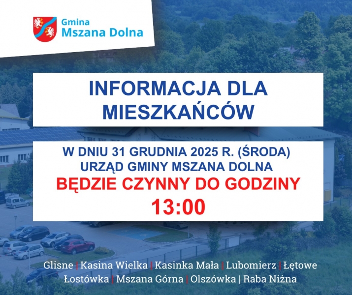 Informujemy, że w dniu 31 grudnia 2025 r. (środa), tj. w Sylwestra, Urząd Gminy Mszana Dolna będzie czynny do godziny 13:00.