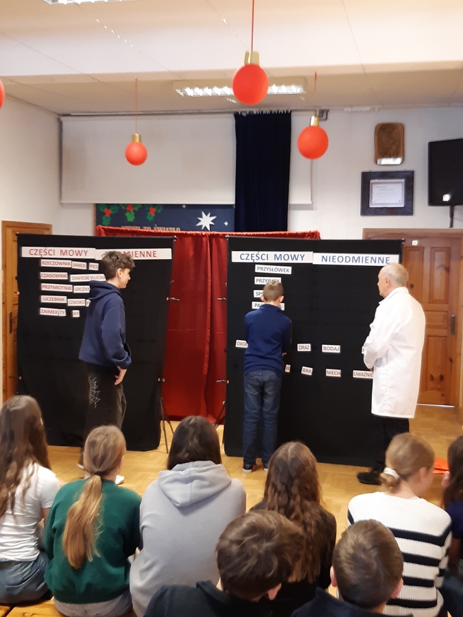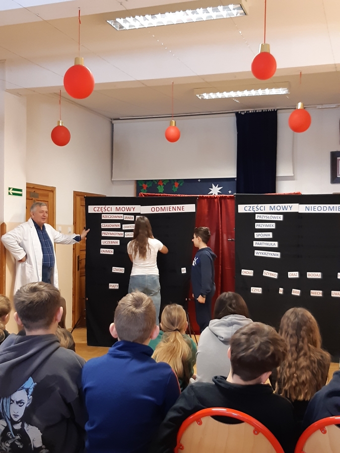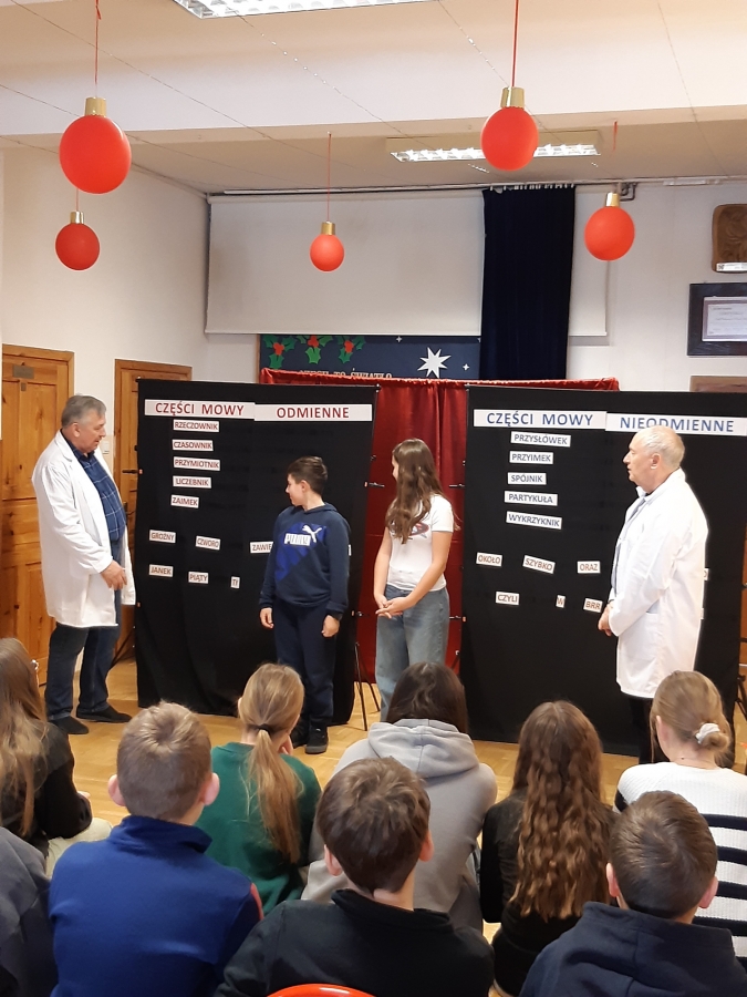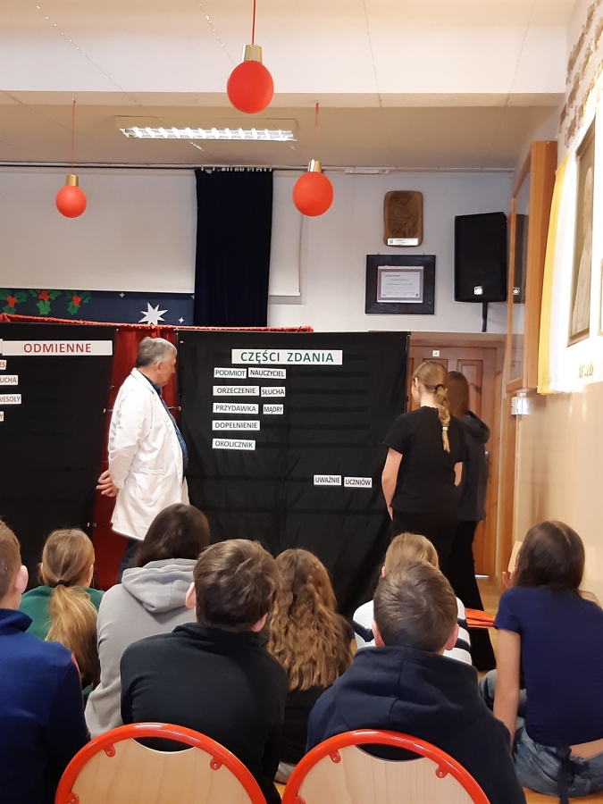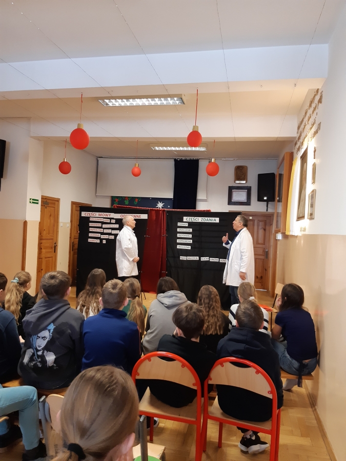 Uczniowie mieli również okazję, by w ciekawej formie i atmosferze zabawy poznać lub powtórzyć wiadomości na temat części mowy i zdania, uczestnicząc w przedstawieniu „Gramatyka” przygotowanym przez aktorów krakowskich scen - Wojciecha Habelę i Jacka Lecznara, których Szkoła Podstawowa nr 3 w Kasince Małej corocznie gości. Artyści w zabawny i przystępny sposób przedstawili młodzieży informacje gramatyczne przeplatane m.in. wierszami Aleksandra Fredry, Ignacego Krasickiego, Jana Kochanowskiego, Adama Mickiewicza, wyliczanką „Dziesięcioro bałwaniątek” i humorystycznymi dialogami. Na koniec angażowali do działania chętnych uczniów, którzy mieli za zadanie przyporządkować wyrazy do określonych grup.