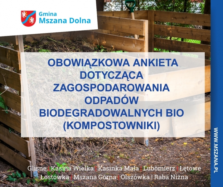 Wójt Gminy Mszana Dolna przypomina mieszkańcom, którzy korzystają z ulgi w części opłaty za gospodarowanie odpadami komunalnymi (kompostujący bioodpady) o wypełnienie oraz złożenie obowiązkowej ankiety dotyczącej zagospodarowania odpadów biodegradowalnych BIO (kompostownik).
