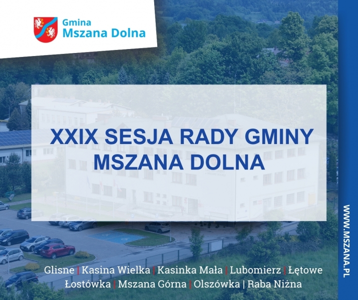Na podstawie art. 20 ust. 1 ustawy z dnia 8 marca 1990 r. o samorządzie gminnym (t.j. Dz. U. z 2025 r. poz. 1153 ze zm.) zawiadamia się, że XXIX sesja Rady Gminy Mszana Dolna odbędzie się w dniu 27 lutego 2026 r. (piątek) o godz. 9:00, w sali obrad Urzędu Miasta Mszana Dolna, ul. Piłsudskiego 2.