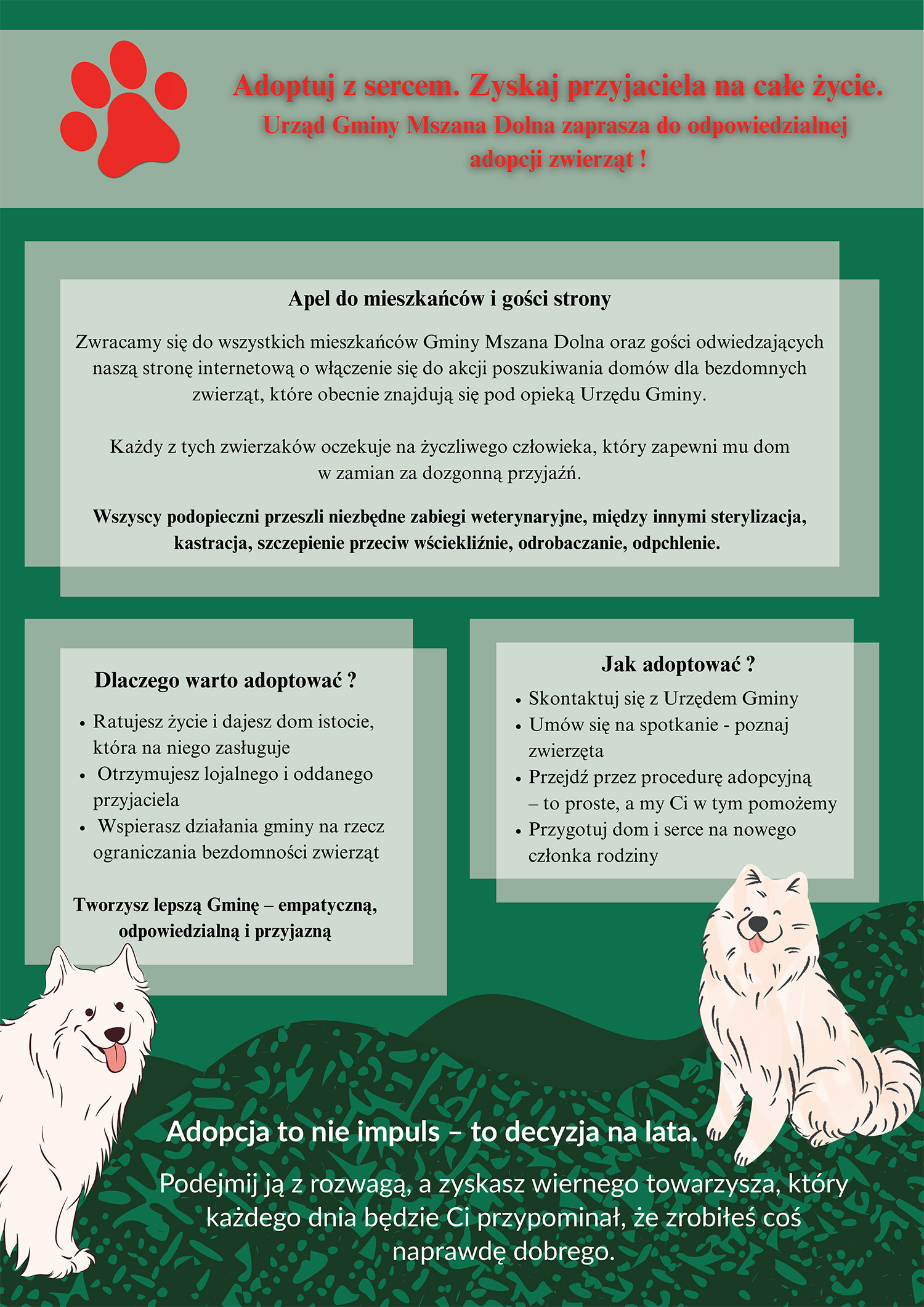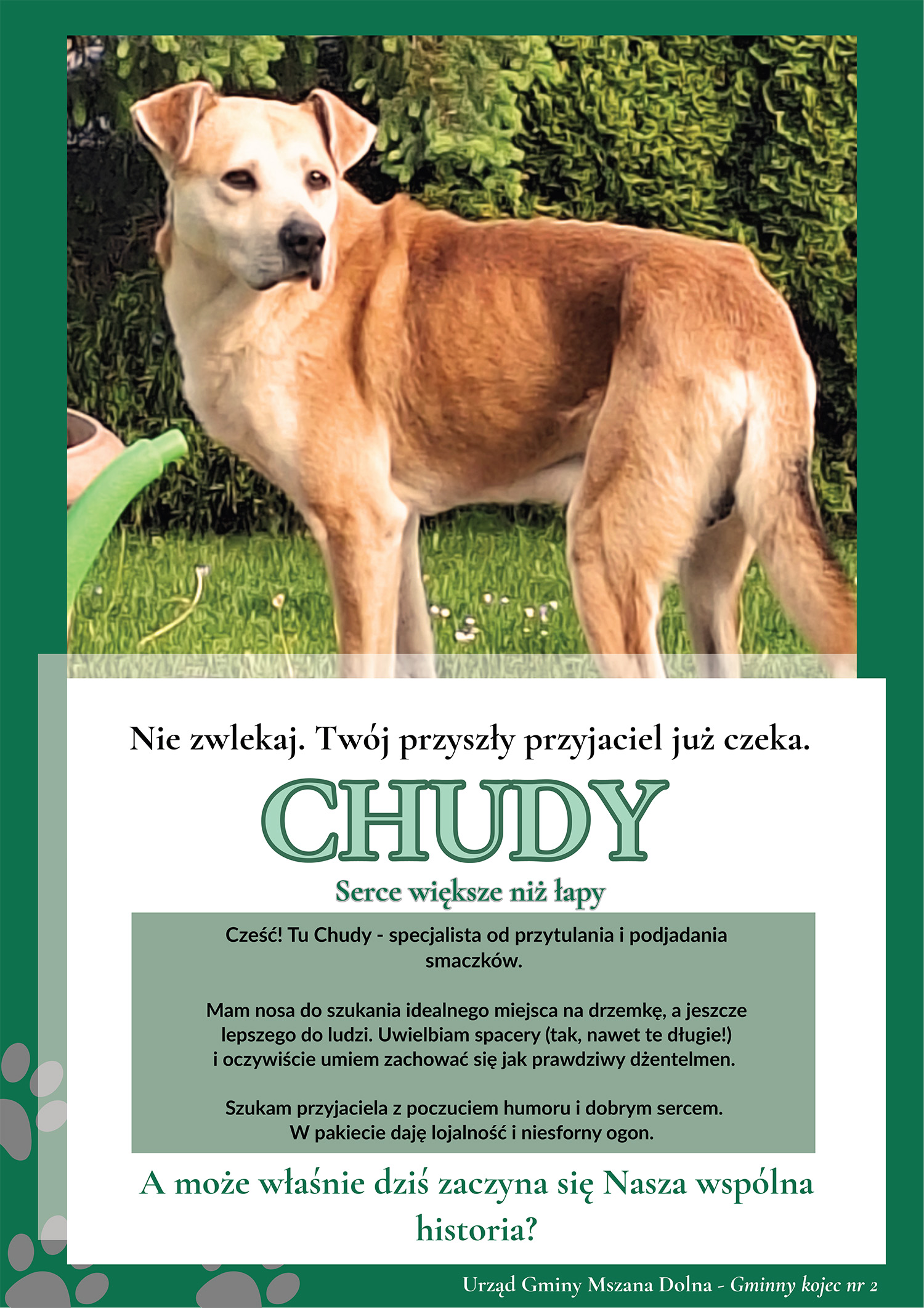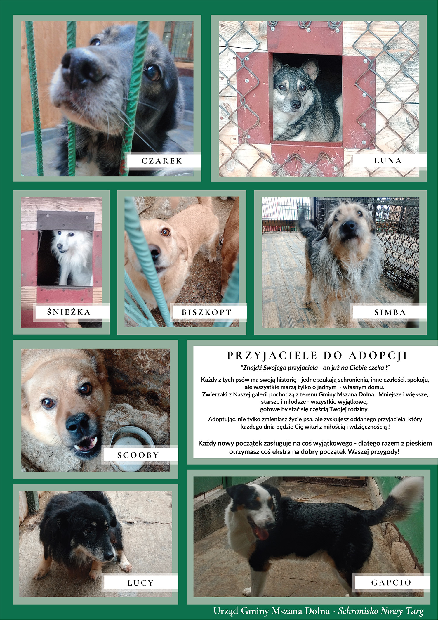 Zwracamy się do wszystkich mieszkańców naszej Gminy i gości odwiedzających naszą stronę internetową o włączenie się do akcji poszukiwania domów dla bezdomnych zwierząt, które obecnie znajdują się pod opieką schroniska dla bezdomnych zwierząt w Nowym Targu i Urzędu Gminy. Każdy z tych zwierzaków oczekuje na życzliwego człowieka, który zapewni mu dom w zamian za dozgonną przyjaźń. Wszystkie psy przeszły zabiegi weterynaryjne. W przypadku kociąt możliwa jest sterylizacja po osiągnięcia dojrzałości przez zwierzęta. W sprawie zwierząt do adopcji informacji udzielą pracownicy Referatu Ochrony Środowiska i Leśnictwa Urzędu Gminy Mszana Dolna tel. 18 3310009 wew. 139 Poniżej prezentujemy psy do adopcji przebywające w schronisku w Nowym Targu