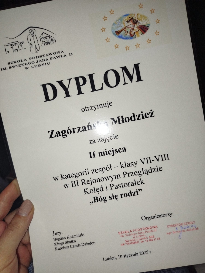 Każda grupa z zaangażowaniem przygotowywała się do występu, a podczas wyjazdu  nasi uczniowie zachowali się z kulturą i godnie zaprezentowali szkołę, stając na podium w każdej kategorii: Zespół Gwiazdeczki (kategoria klas 4-6) wyśpiewał I miejsce pastorałką "W Betlejem krainie", Zespół Zagórzańska Młodzież (kategoria klas 7-8) zdobył II miejsce kolędą "Gore gwiazda". Następnie zwycięzcy wzięli udział w Koncercie Laureatów – informują nauczyciele z kasinczańskiej trójki.