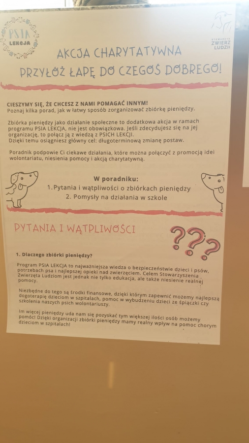 Szkoła Podstawowa nr 3 w Kasince Małej wzięła udział w programie PSIA LEKCJA i zebrała pieniądze na dogoterapię dla dzieci w szpitalach.